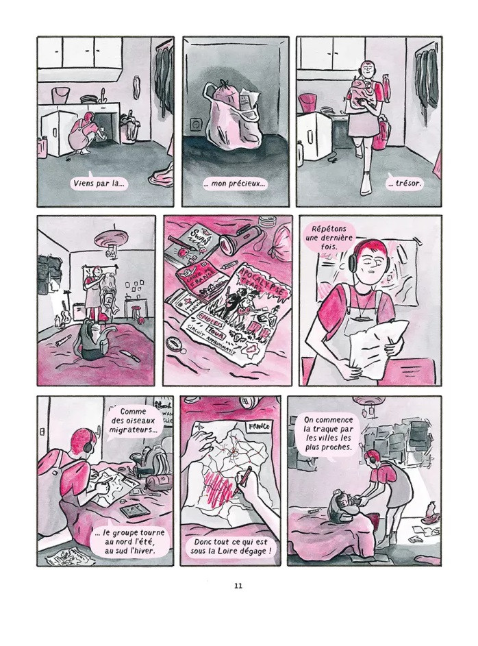 A priori rien à voir avec le dessin de l’illustratrice qui, dans un rose tranchant, décrit avec dynamisme les pérégrinations sous fonds gris de Swann et Murphy. L’univers post-apocalyptique est chaotique, les règles n’existent plus, on n’est donc pas surpris de voir que Mathilde Payen s’amuse avec les proportions parfois biscornues de ses personnages. Certains bloqueront là-dessus, moi pas car j’y vois une certaine originalité dans le traitement d’un genre plus que sur(?)-exploité dans la culture pop de ces vingt dernières années. Et que dire du sujet du passage à l’âge adulte ? Ici, il s’agit d’exprimer via son héroïne une recherche viscérale du sens même de l’existence. Et comme par hasard ! (prendre la voix d’Albert Dupontel dans Bernie) elle s’appelle Swann ! Le nom du personnage d’A la recherche du temps perdu s’insère inconsciemment (ou non) comme une pièce d’un scénario qui évolue au fil de la lecture.