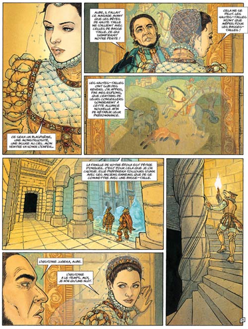 D’abords, j’ai trouvé le dessin d’Elvire De Cock particulièrement agréable. On finit par être emporté par cette ambiance magique et fantastique grâce au talent de cette dessinatrice. Et puis à l’instar d’une Alice Picard, d’Ana Miralès ou d’une Béatrice Tillier, les femmes dessinatrices apportent un plus indéniable avec notamment une perfection des détails vestimentaires .Le résultat est souvent très esthétique et très inventif dans les coupes des habits. Ici, par exemple, le personnage d’Arawen m’a particulièrement ébloui par son élégance.