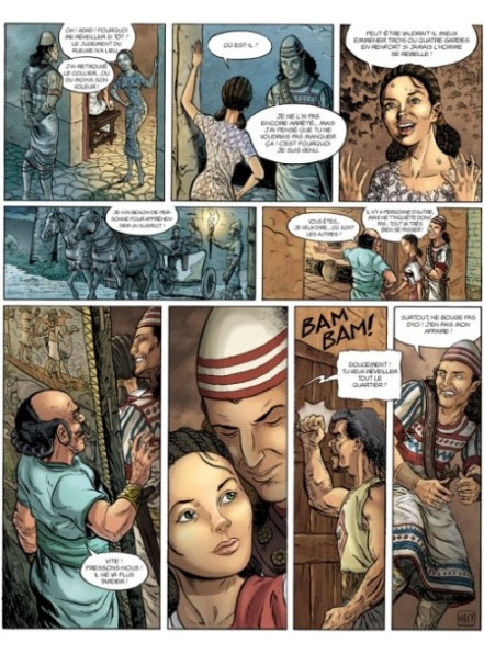 D’abord un coup de gueule, pourquoi faire des collections comme Portail chez le Lombard ou Dédales chez les Humanos pour les arrêter quelques temps après leur création ? On peut espérer que les séries de ces collections ne soient pas laissées à l’abandon. Pourquoi je vous parle de la défunte collection Dédales ? Car initialement, ce dyptique devait y figurer. Et c’est vrai que ce polar antique aurait eu sa place sans problème dans cette collection. Le point fort de cette BD, c’est qu’on sent que les auteurs se sont hyper documentés sur cette Babylone antique et donc on a ici un récit qui semble bien crédible du point de vue historique. Par contre ce qui ne l’est pas du tout crédible, ce sont les expressions sur les visages. L’héroïne a souvent un éternel sourire qui ressemble plus a un rictus qu’autre chose. D’ailleurs le dessinateur pour moi n’arrive pas à retransmettre les émotions via son dessin et c’est bien dommage ou alors c’est d’une manière très excessive et pas du tout naturelle sans parler du coté statique du trait. Le scénario lui se dissipe aussi dans une complexité excessive à cause des 3 enquêtes menées de front et un rythme mené tambour battant en oubliant de nous faire mieux connaître les protagonistes. Bref, j’ai trouvé la pochette bien belle, le reste……..