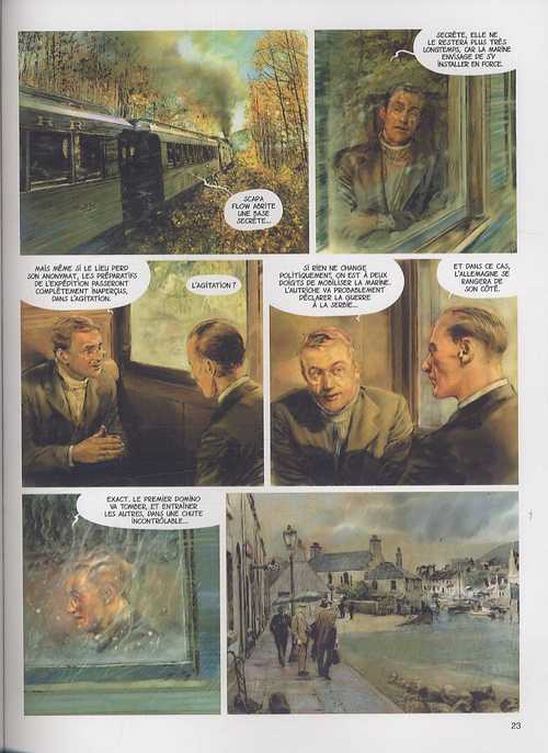 La première fois que j’ai eu en main cet Adamson, je l’ai reposé quasi illico. En effet, j’étais plus que circonspect par rapport au dessin. Et puis grâce à un très bon avis de mon libraire et des bonnes critiques, j’y ai rejeté un œil .L’époque (début 1914) et le milieu maritime de guerre m’ont décidé à revenir sur ma décision. Pour le dessin, je n’ai pas spécialement changé d’avis. On dirait un mélange de peinture et de photos retravaillées. J’eu parfois l’impression de lire un roman-photo. Les perspectives sont également souvent très floues et sombres, ce qui donne au final, une atmosphère très pesante et surtout étonnamment envoutante.