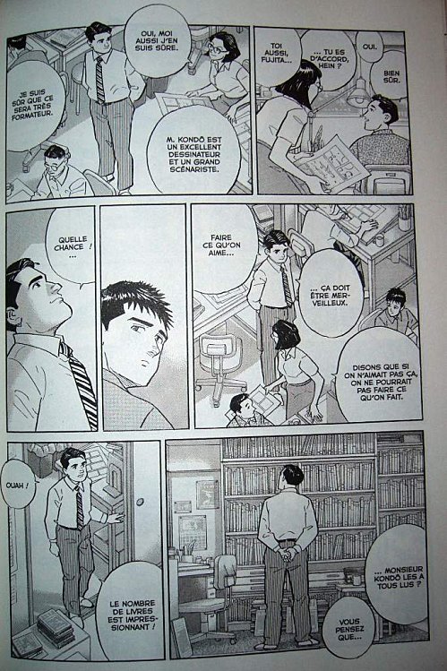 Mon avis de Capitol: Nouvel ouvrage du plus européen des Mangakas, Jirô Taniguchi. Ce récit, en partie autobiographique, raconte les débuts d’un jeune homme qui monte à Tokyo pour embrasser la profession de ses rêves, dessiner des mangas. Rapidement engagé dans un studio réputé, il se retrouve plongé dans un univers qui ressemble plus à l’usine, avec ces échéances à respecter coûte que coûte, avec les nuits blanches et tout le toutim…L’enrichissement personnel fait vite place à la frustration des cadences soutenues et l’impossibilité de se concentrer sur son projet personnel. C’est donc toute cette industrie qui nous est décrite par le détail. Mais Taniguchi ce n’est pas uniquement un témoin d’une époque et d’une profession. C’est aussi un maître dans l’art de raconter une histoire par les petits détails qui semblent de premier abord anodins mais qui donnent au final un éclairage tout à fait différent de l’univers manga. Le vécu du héros principal est analysé tant au niveau psychologique qu’au niveau sentimental. La motivation et le comportement de chacun est bien développé, ce qui donne une proximité du lecteur avec les personnages mais aussi une fluidité dans la lecture déconcertante. C’est là qu’est tout le talent de l’auteur…Rendre une histoire simple mais profonde. Je retrouve ici, mais à un autre niveau, l’étude psychologique des personnages que j’avais déjà trouvée dans « le sommet des Dieux », une histoire d’alpinisme où la montée de l’Everest n’était qu’un prétexte à un autre défi, le dépassement de soi. J’ai retrouvé ici les mêmes valeurs…Le dessin est toujours du même niveau, très lisible mais aussi européanisé. On n’y retrouve pas les poncifs graphiques bien connus du style « mangas ».