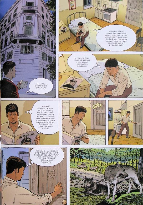 Résumé (de l’éditeur) : Tout le monde connaît la légende de Romulus et Remus. Peu de gens savent, en revanche que les descendants de Remus jurèrent de le venger et fondèrent la société secrète des «Fils de la Louve». Encore moins savent qu’il échoit aujourd’hui à Luca, un descendant de Romulus, de mettre un point final à cette lutte millénaire. C’est en 1943, en pleine Rome fasciste, qu’il devra en découdre une dernière fois avec ces «Fils de la Louve» acoquinés aux troupes mussoliniennes pour l’occasion.