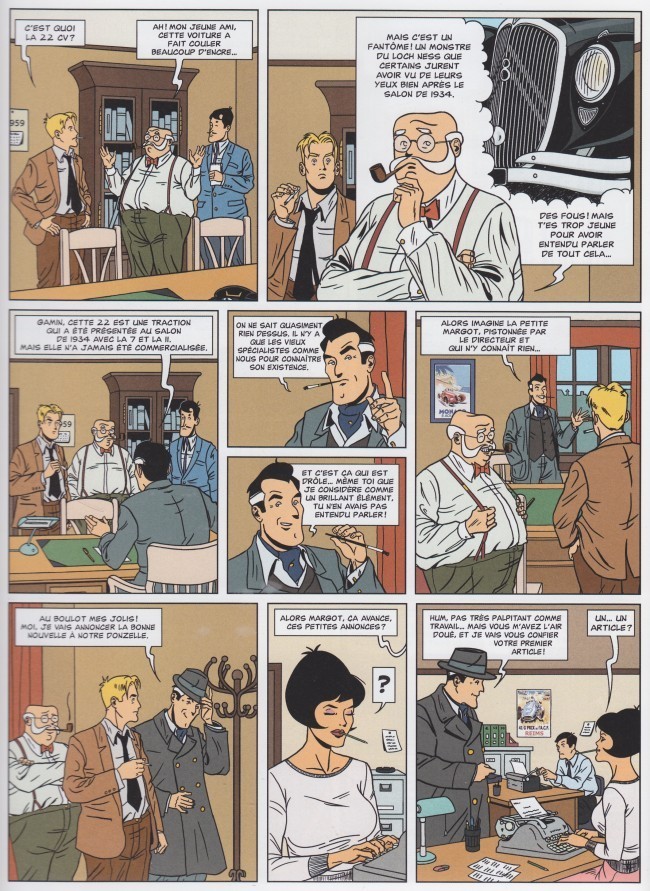 C’est donc une réussite au niveau graphique. Pour le scénario, il s’agit d’une enquête journalistique qui emmène le lecteur sur la piste de la Traction Citroën 22 CV. J’ai lu cet album d’une traite sans me poser beaucoup de questions, c’est pour moi révélateur d’une certaine qualité du scénario. On n’atteint pas les sommets mais cela reste très plaisant à lire et je comprends tout à fait le succès remporté par cette série « Calandre ».