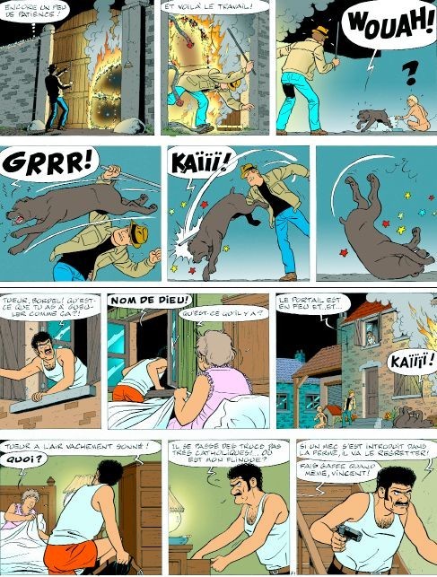 Voilà pour ce qui concerne la genèse de l’album. Reste maintenant la critique. Je dois bien avouer que je n’ai pas lu les deux premiers tomes mais cela n’empêche pas de comprendre l’histoire et de se faire une idée précise du travail de Tibet. Tout d’abord, Tibet s’occupe seul du dessin et du scénario. Pas d’André Paul Duchateau mais ce n’est pas une nouveauté pour Tibet puisqu’il a déjà travaillé de cette façon sur la série « Chick Bill ». Il garde le même style de dessin que sur Ric Hochet (appelé par certains « semi réaliste »).Le récit est raconté à la première personne, c’est Aldo Remy qui raconte. Et on ne peut pas dire que c’est langue de bois. C’est direct, c’est moderne. Le personnage principal est un peu « brut de coffrage », son langage n’est pas très châtié. Sa copine Manon est plus nue qu’habillée (Elle fait le ménage avec un petit tablier,…rien que le tablier)…Le ton est donné. Plus rien à voir avec l’amour platonique entre Ric Hochet et Nadine…La trame de l’histoire est plutôt dramatique mais le traitement du sujet met une touche de dérision, le cocasse est de bon aloi. Cela donne un album décalé et tout à fait différent de ce que faisait habituellement Tibet.