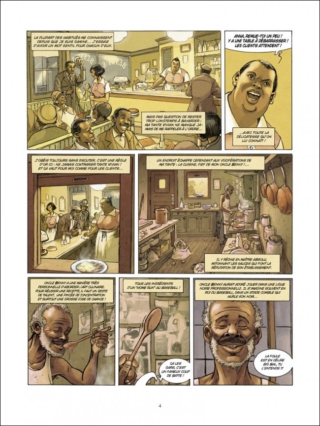 Bien sûr, ce premier tome pose les bases d’une intrigue pour l’heure assez classique (voire un peu « déjà vue »), mais la justesse des faits historiques, l’attention particulière portée aux personnages (comme toujours chez Callède) et le dessin tout en rondeur de Séjourné, ajoutent énormément à l’ensemble ! Pour le dessin, ce dernier s’est vraiment surpassé, faisant revivre Harlem comme si vous y étiez ! A un moment, c’est une chanteuse de blues célèbre (Ethel Waters) qui fait son apparition, ses textes planant sur les habitants comme sur le lecteur, émerveillés par tant de poésie ! A un autre, c’est un homme d’affaires, un taxidermiste renommé ou encore un autre groupe, jadis très connu… Le récit est véritablement ancré dans son époque, un petit lexique en fin d’album nous invitant d’ailleurs à nous cultiver davantage sur celle-ci !