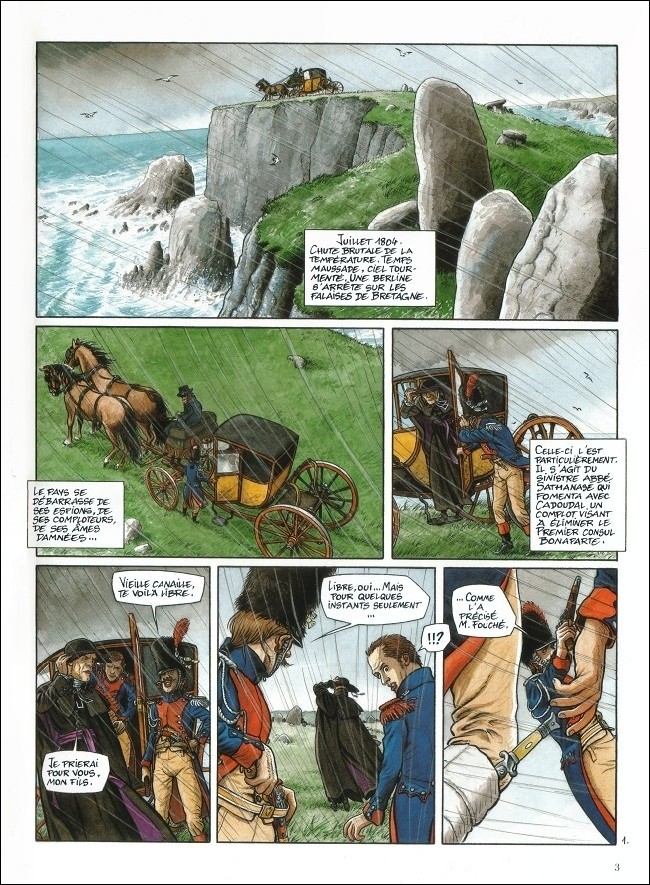 Je fais peut être une faute mais j’ai toujours comparé cette série Double masque avec Giacomo C (une autre série de Jean Dufaux avec Griffo). On y retrouve aussi le bon esprit, les bons mots assaisonnés d’une petite dose de comédie de boulevard mais il n’y a rien à faire, on n’arrive pas à trouver la même jouissance que dans les aventures de Casanova. Double masque se la joue trop sérieux en mettant l’accent quasiment uniquement sur les intrigues pour le pouvoir. Les petits détails sont trop anecdotiques pour nous faire sourire. En parlant du scénario, on a l’impression de tourner en rond depuis 2 albums. La course à l’échalote de diabolo et Sathanase, on commence à connaitre.
