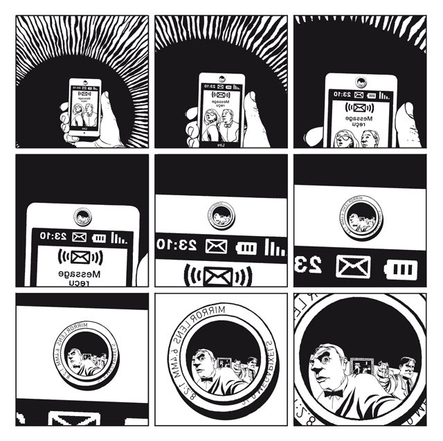 3 secondes est un vrai laboratoire, avec sa version numérisée (voir le site de Delcourt, mais si possible après avoir lu le livre). D’ailleurs il vous faut le mot de passe du livre). Votre regard plonge infiniment plus que vous ne le pensiez, rebondit à travers 33 miroirs disposés où vous ne l’imaginiez pas, pour explorer une scène digne de »La Chambre Jaune ». Une vraie investigation policière, sur fond de matchs truqués, dont les indices sont disséminés dans un loft, dans une galerie, sur les toits d’un building, dans un bureau, dans un avion de la Swiss Air, dans la rue, dans les journaux, dans les moindres recoins. Sur le site de Delcourt, le forum regorge déjà, au sujet de ce qui sera un des livres de l’année, de suppositions, de tentatives de résolutions, à la Da Vinci code. Ne sabotez pas votre plaisir et faites-vous d’abord VOTRE idée. Découvrez les références et hommages qui parsèment ce livre sans parole, mais pas sans contenu. Fouinez partout, allez tester le vertige de la version numérique (digne des prédictions de Scott Mac Cloud concernant le devenir de la BD). Admirez le noir et blanc précis et chirurgical de MAM (ses initiales constituent un anagramme, je ne l’ai découvert qu’à la lecture, juste avant de découvrir qu’anagrammes et palindromes étaient d’autres miroirs constituant un vrai palais de glaces). Mais découvrez aussi le plaisir des traits agrandis, déformés, des agrandissements à la « Blow Up ».