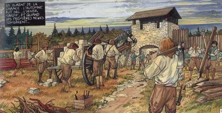 Mon avis : Une grande bande rouge entoure l’album : « Après Sept Cavaliers, poursuivez la saga des Pikkendorff!». Delcourt a regroupé à posteriori les « Sept Cavaliers », considéré comme un premier cycle, avec cet album, premier d’un deuxième cycle de trois albums, sous la dénomination « La saga des Pikkendorff ». Je vous rassure directement, ce nouvel album n’a rien à voir avec le premier cycle, si ce n’est que l’on parle de membres différents de la même famille à travers les siècles .Il est donc tout à fait possible de commencer avec ce « Royaume de Borée », sans avoir lu le premier cycle. J’avais beaucoup aimé « Sept cavaliers » et cela ne risque pas de changer avec ce nouvel album. Dès la première planche, la magie recommence. Jean Terpant nous plonge directement dans une nature fabuleuse et dans des thèmes chers à Jean Raspail. Ils nous décrivent ces bouts du monde où il n’y a que peu de gens qui osent s’y aventurer. Des mondes où tout est vierge ou presque, où il faut défricher, construire, inventer, stimuler les âmes, bâtir des légendes. Le dessin de Terpant est toujours aussi abouti et maîtrisé. C’est un vrai plaisir pour les yeux et en plus vient s’y greffer une colorisation extraordinaire. Le scénario de Jean Raspail, très bien adapté par Terpant et très fidèle au roman original, nous plonge dans un état imaginaire mais très proche d’une certaine époque et d’une certaine géographie. L’histoire nous donne un souffle d’épopée mais aussi la défense de certaines valeurs de droiture, de fidélité et de dévouement envers un pays en construction. Hélas, le paradis n’est pas fait que de bonnes intentions et des tensions vont apparaître…