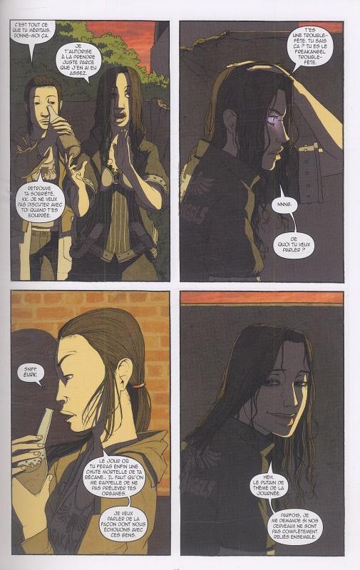 Ce que j’apprécie dans ce comics made in GB, c’est indéniablement son originalité. Tout d’abord pour son graphisme très particulier de Duffield dans un cadre invariable de 2 à 4 cases identiques par page .J’y ai noté quelques imperfections sur les perspectives mais ce qui marque, ce sont les visages. Comme à chaque fois qu’on parle du dessin, c’est entièrement subjectif et ça passera ou cassera en fonction de vos gouts. Du coté du scénario, après un début un peu soporifique à cause d’une bonne cuite, on reçoit une bonne dose d’adrénaline avec l’attaque au mortier sur whitechapel . Rien de spécialement nouveau par rapport au tome 1 mais la bonne surprise arrive vers le fin avec une discussion pour une nouvelle société dans ce monde post apocalyptique. Comme l’intrigue est dévoilée de manière parcimonieuse, il reste encore beaucoup de mystère à découvrir et de chemins à prendre pour arriver au bout des 6 tomes prévus. Un récit de science fiction qui met surtout l’accent sur les relations humaines et c’est avec envie que j’attends de me plonger dans le tome 3 car cette série à le grand mérite de me surprendre.