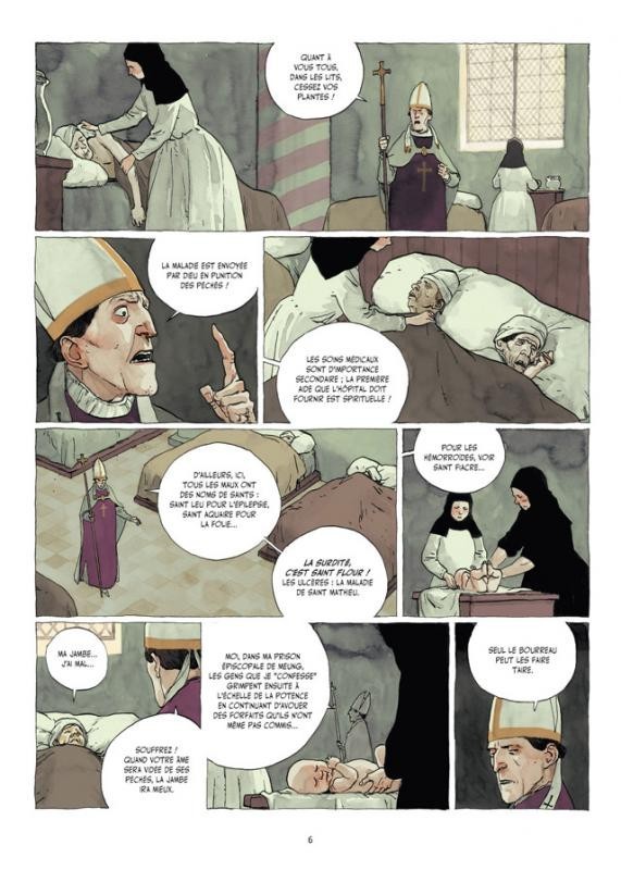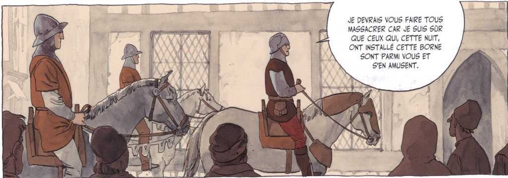 Reste le scénario. La base, le roman de Jean Teulé, a eu un grand succès en librairie. Luigi Critone en a fait une adaptation assez réussie. Il a gardé le rythme de narration en divisant l’album en chapitres courts mais vifs. Cet album n’est pas à mettre en toutes les mains. On y raconte une société en pleine construction entre barbarie, féodalité et religion, où le sordide se mêle à la misère et à la cruauté. La justice est expéditive et ne fait pas dans le détail. Les châtiments font froid dans le dos. Pour une peccadille, le pauvre justiciable y a droit. L’innovation, la méchanceté et le sadisme n’ont aucune limite en la matière ! Jean Teulé s’est bien documenté. Quelle est la part de la réalité et du romanesque ? La marge est ténue. Malgré le coté glauque de certaines scènes, cela se laisse lire très facilement. Cela ne manque pas par moment d’humour mais ce n’est pas la farce et l’immense éclat de rire du « Montespan ».