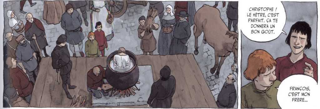 Mon avis : Passionné par l’Histoire avec un grand H, et par le romancier Jean Teulé, j’ai directement pointé cette sortie BD chez Delcourt. J’avais adoré l’année dernière la sortie en BD d’un autre de ses romans « Le Montespan », dessiné et adapté par le regretté Philippe Bertrand. Jean Teulé a toujours su nous faire découvrir des périodes ou des évènements peu connus de l’Histoire. Il nous décrit avec de nombreux détails la vie quotidienne de l’époque avec en prime un humour décapant qui me plait beaucoup. C’est Luigi Critone (sept missionnaires, La Rose et la croix) qui s’y colle et le résultat est très bon. Le dessin est bien maîtrisé et est très agréable à lire. C’est pour moi une découverte, n’ayant pas lu ses ouvrages précédents. Les couleurs restent dans des tons sobres et sombres avec peu de couleurs vives, dans des tonalités qui reflètent bien l’idée qu’on se fait du Moyen-Âge.
