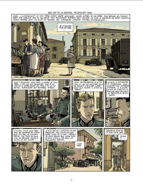 Mon avis : Voilà une série qui petit à petit a fait son trou, sans grand tapage, mais qui est devenu une valeur sure du catalogue Casterman. C’est l’histoire d’un allemand engagé dans la Wehrmacht en France. Il y fait la connaissance de Katarina, devenue par la suite Catherine. Ils vont se perdre de vue car Catherine a décidé de changer de nom et de s’engager dans la résistance. C’est une superbe chronique de Martin, un allemand plongé malgré lui dans les fracas de la guerre 40-45. Il n’a pas le choix, il doit servir son pays sous peine de devenir un traître. Les auteurs nous permettent de voir l’autre face du miroir, du côté allemand. C’est très instructif. Ce cinquième tome est cependant radicalement différent des précédents. On y voit très peu Martin. Il est mis entre parenthèses momentanément. Ce tome se concentre sur Catherine. Il nous fait découvrir de l’intérieur la vie d’un réseau de résistance avec ses héros et ses traîtres, où chacun se demande qui est qui…