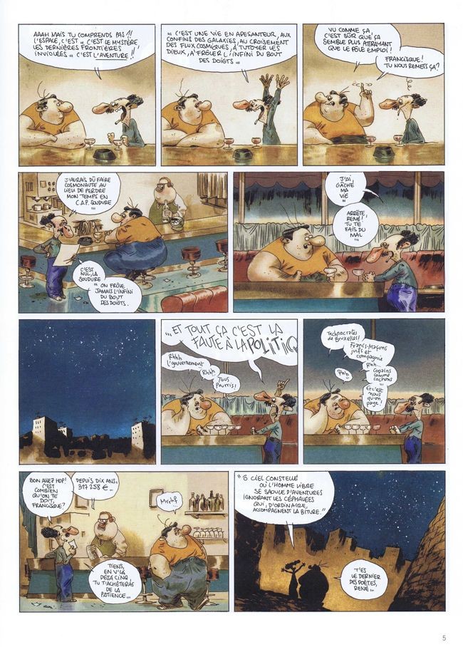 Voilà donc qu’on retrouve Valérian dans un bistrot à Paris où il n’est plus que l’ombre de lui-même. Avachi, vieilli, on est loin du compte par rapport au Valérian de la série à succès… Mais, c’est plutôt son esprit qui est là dans le corps d’un malheureux terrien qu’il va falloir ramener dans l’espace avec pour mission de réhabiliter l’intégrité physique et mentale de Valérian. En effet, l’enveloppe physique de Valérian se trouve dans une sorte de formol et son esprit a été transplanté bien loin de là, dans le corps de ce terrien qui ne paie pas de mine et qui n’a pas l’air trop futé. C’est un peu iconoclaste comme vue, comme début, mais Larcenet s’y connaît pour laisser vagabonder son imagination… Je vous passe toutes les péripéties.