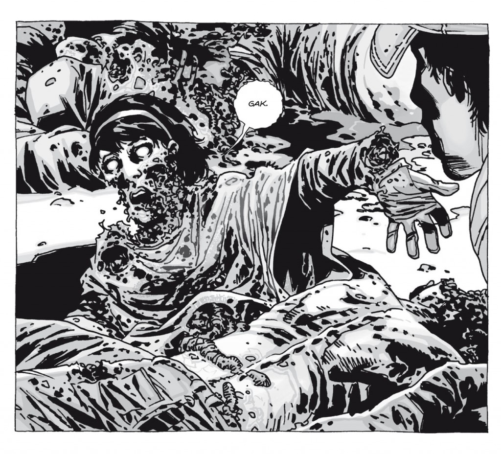Le tome 15 reprend l’histoire là où nous l’avions laissée. Après l’effusion de sang qui vient de se dérouler dans l’enceinte de la communauté, l’heure est à le réorganisation. On réfléchit, on brûle les cadavres, on attend, on discute, on rediscute, Rick se lamente sur son sort, Carl est entre la vie et la mort, on se dispute encore, …et c’est tout. Bref, le lecteur s’ennuie furieusement dans ce numéro dont les grands absents sont les zombies.