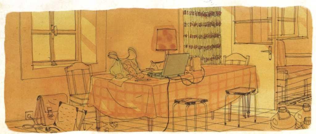 Extérieurement, il s’agit d’un bel album, volumineux et cartonné qui pèse lourd. Je l’ouvre…De suite, ce qui saute aux yeux, c’est le graphisme. Pas franchement abouti mais on sent une « patte ». Pour certaines planches, on a l’impression que le dessin est enfantin alors que pour d’autres, il est beaucoup plus mature. Des planches sont bien finies alors que d’autres ressemblent plus à des brouillons, des croquis jetés négligemment mais sublimés par la mise en couleur. En parlant de couleurs, celles-ci sont déconcertantes. Beaucoup de teintes dans les ocres, les jaunes mais aussi des tons plus en rapport avec l’histoire, le moment de la journée, la qualité ou l’intensité de la lumière, que veulent faire passer l’auteur et sa coloriste (Pedrosa et Ruby). Cela ressemble plus par moment à un laboratoire qu’à quelque chose de totalement maîtrisé…Je dois bien dire que par moment j’ai été un peu déstabilisé et je n’ai pas toujours adhéré…