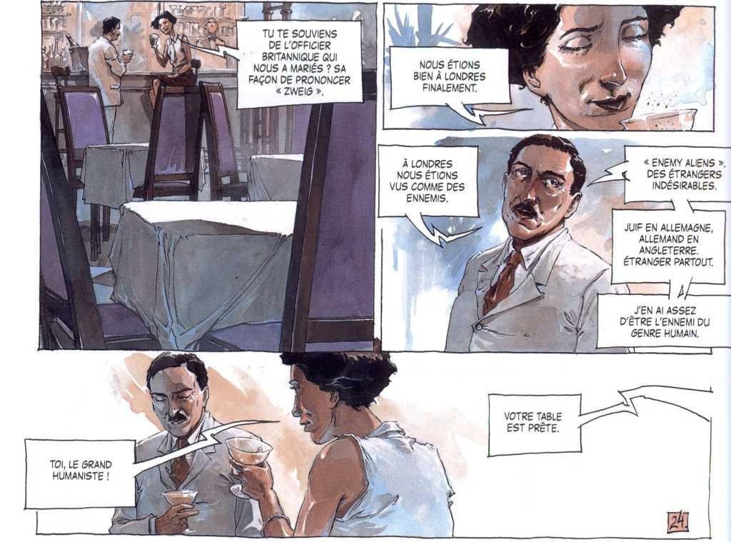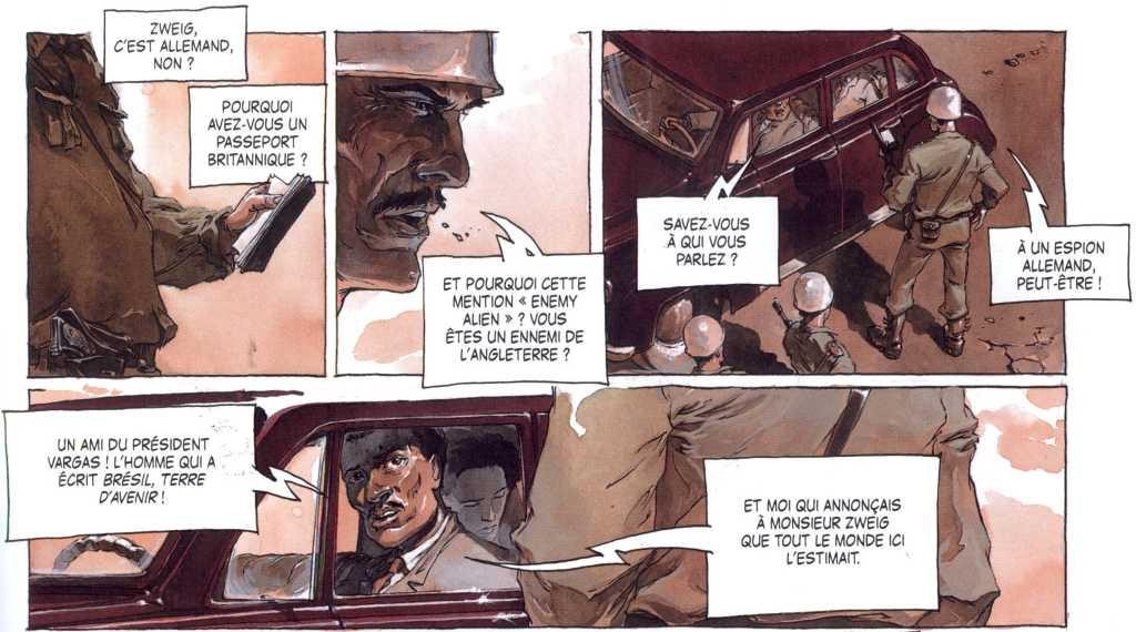 Résumé (de l’éditeur) : Conjuguant réel et fiction, cette Bd revisite les six derniers mois de la vie du couple Zweig, entre nostalgie des fastes de Vienne et appel des ténèbres. Passés successivement par l’Angleterre et les États-Unis après avoir fui l’Autriche, Stefan et Lotte avaient cru fouler au Brésil une terre porteuse d’avenir. Mais c’était sans compter avec l’épouvante de la guerre.