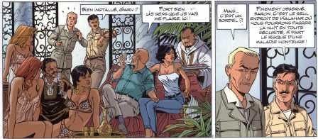 J’ai surtout apprécié l’humour décalé du scénario et certaines scènes et répliques qui valent leur pesant d’or. Van Hamme se moque de son personnage Wayne Shelton, beau héros vieillissant, qui doit assumer sur le plan financier et sur le plan physique pour maintenir son rang. D’où cette réplique culte de Honesty à Wayne Shelton : « -Tu vieillis, Wayne Shelton. Il serait temps de penser au fauteuil à bascule et aux pantoufles. » Faut-il vraiment se cotiser pour payer une paire de pantoufles à Jean Van Hamme ? Confortable les pantoufles, hein ! Cet album est très plaisant, aura du succès mais il n’obtiendra pas de prix à Angoulème…