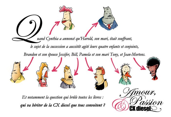 Amour, passion et CX diesel relate les déchirants complots qui peuvent voir le jour au sein de la famille Gonzales pour hériter le patrimoine du patriarche, c’est-à-dire une Citroën CX diesel. Au menu : alliances, trahisons, vengeance, infidélité et humour crétin. Tous les coups sont permis.