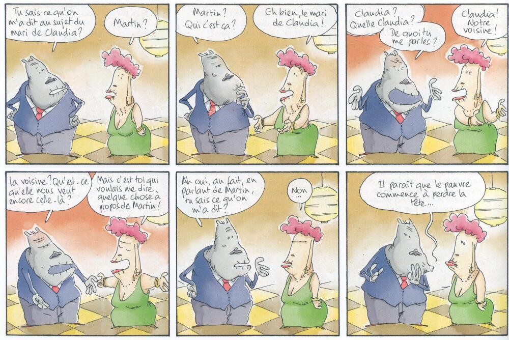 Amour, gloire et bea…euh pardon, Amour, passion et CX diesel parodie, comme son nom l’indique pratiquement, l’ambiance sitcom à l’eau de rose. Un univers impitoyaaaaaable (air connu) qui illustre une famille qui se déchire, où tous convoitent la cx diesel. Au format strip, les deux gags par page sont d’une très grande efficacité car à la fois rapides et tranchants pour tenir en six cases. Dans ce style d’album, il faut impérativement maintenir un niveau du début à la fin, la moindre baisse de régime est fatale, chaque chute doit faire rire et Fabcaro, le scénariste, relève ce défi haut la main. Il parvient également à faire évoluer la saga dans le deuxième album en laissant un peu plus sur le côté la cx diesel (qui occupe tous les esprit dans le tome 1) pour aborder le coming out d’un membre de la famille et d’autres sujets qui étaient moins exploités dans le premier album/tome.