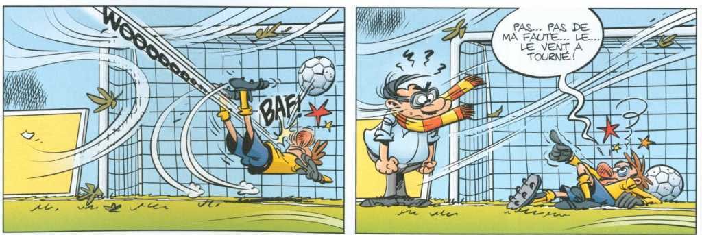 Le liégeois Olivier Saive est au dessin. Ses antécédents plaident pour lui. Après une semaine à Saint Luc (faut le faire!), il est l’apprenti de Colman puis travaille chez Marsu prod avant de débarquer chez Bamboo. Trois scénaristes se creusent la nénette pour pondre des gags, si possible, désopilants. L’usine à gaz ? Que nenni ! Ils s’en tirent bien les bougres ! Evidemment, ils ne remporteront pas le prix Goncourt, ni le Pulitzer. Il n’ont rien gagné à Angoulème, à ce que je sache…On n’est pas dans le sérieux, le torturé ou le cérébral. Mettez vos pantoufles (pour les sportifs en chambre) ou vos chaussures de sport (pour les autres), enlevez votre cravate, détendez-vous et en avant pour une bonne tranche de rigolade ! C’est bon enfant, tous publics. Pas besoin d’avoir la grosse tête, juste une lecture saine, décontractée et joyeuse. Que demandez de plus ? Les gosses adorent, les parents lisent aussi, parfois en cachette…