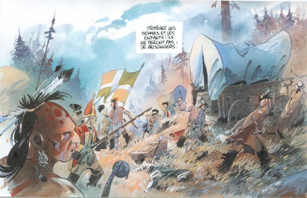 Il est de la même veine que Frenchman. Si vous avez aimé l’un, vous aimerez l’autre. Même duo d’auteurs, même façon d’aborder le sujet, même graphisme, même façon de mettre en couleur, même lieu et même époque. Et aussi en fin d’album, un cahier graphique somptueux qui donne toujours la même impression d’excellence du dessin de Prugne. A vous les grands espaces, le Canada, la guerre entre la France et l’Angleterre, par soldats mais aussi par tribus interposées.