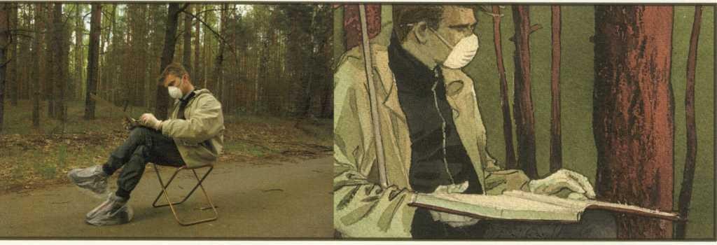 Sur le plan du dessin, l’auteur continue sur base de la recette qui lui a valu le succès de l’album précédent. Une bande dessinée classique en majorité en noir et blanc (surtout en noir), mixée avec des croquis bruts mais ô combien symptomatique de l’état d’esprit de l’auteur, dessinés avec des tripes. Il nous parle aussi de problèmes physiques qu’il éprouve avant son départ. Pour la première fois de sa vie, dessiner le fait souffrir. Il a la crampe de l’écrivain. Il doit arrêter de travailler momentanément…Mais n’est-ce pas purement psychologique ? N’est-ce pas justement la peur de s’engager dans ce projet dangereux et risqué ? Que va-t-on y faire ? Que va-t-on manger sur place ? De la nourriture contaminée ? Beaucoup de questions, d’incertitudes…Et pourtant il va finir par y aller mais en emportant toujours avec lui ses doutes et ses craintes. Au fil de l’album et de son séjour sur place, le lecteur découvre que la main de l’auteur va petit à petit reprendre vigueur et le mal va partir au fur et à mesure qu’Emmanuel Lepage va prendre conscience de son environnement sur place. En fin d’album, alors que le moral est revenu et qu’il se sens de mieux en mieux, reviennent les couleurs mais quelles couleurs : belles, vives et irradiantes !