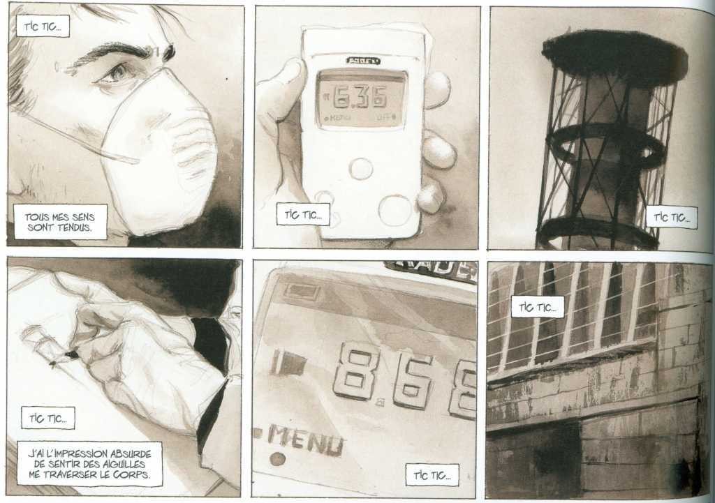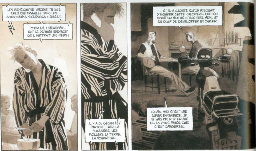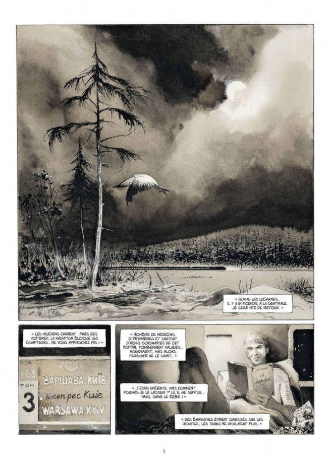 Résumé (de l’éditeur) : 26 avril 1986. À Tchernobyl, le coeur du réacteur de la centrale nucléaire commence à fondre. Un nuage chargé de radionucléides parcourt des milliers de kilomètres. Sans que personne ne le sache… et ne s’en protège. C’est la plus grande catastrophe nucléaire du XXe siècle. Qui fera des dizaines de milliers de victimes. À cette époque, Emmanuel Lepage a 19 ans. Il regarde et écoute, incrédule, les informations à la télévision. 22 ans plus tard, en avril 2008, il se rend à Tchernobyl pour rendre compte, par le texte et le dessin, de la vie des survivants et de leurs enfants sur des terres hautement contaminées. Quand il décide de partir là-bas, à la demande de l’association les Dessin’acteurs, Emmanuel a le sentiment de défier la mort. Quand il se retrouve dans le train qui le mène en Ukraine, où est située l’ancienne centrale, une question taraude son esprit : que suis-je venir faire ici ?