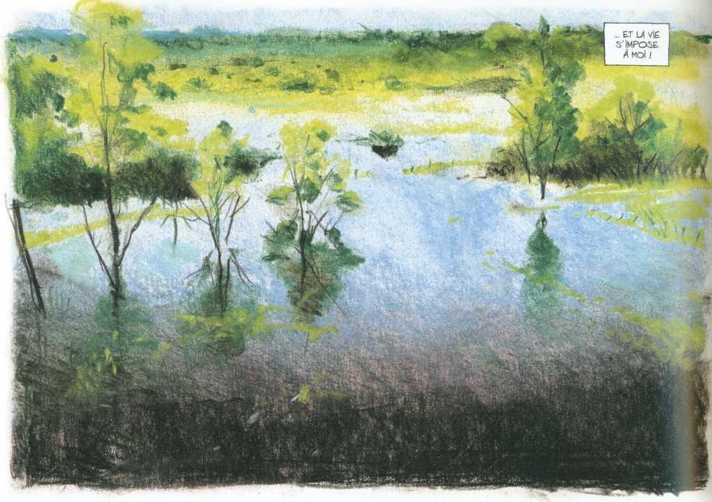 Reste le scénario en lui-même, nourri par le vécu, l’expérience. Facile diront certains ! Il suffit de raconter! Il faut cependant reconnaître à Emmanuel Lepage la capacité de remettre chaque époque dans son contexte et de bien discerner le principal de l’accessoire, l’emblématique de l’anodin, l’action de la réflexion. Le lecteur est bien vite emporté par le récit et va cheminer par divers sentiments comme l’a fait l’auteur. Parti pour dénoncer une situation déplorable dans une démarche écologiste, il va se rendre compte dans un premier temps du chaos engendré par la catastrophe. Par la suite, il va voir poindre malgré tout une sortie de survie, une faune et une flore qui s’adaptent et se développent et enfin un hymne à la vie, bien loin des buts premiers du voyage, presque une trahison par rapport aux objectifs recherchés au départ. Et pourtant, l’auteur a pris parti de témoigner sans faux-fuyant, de dire honnêtement sa vérité.