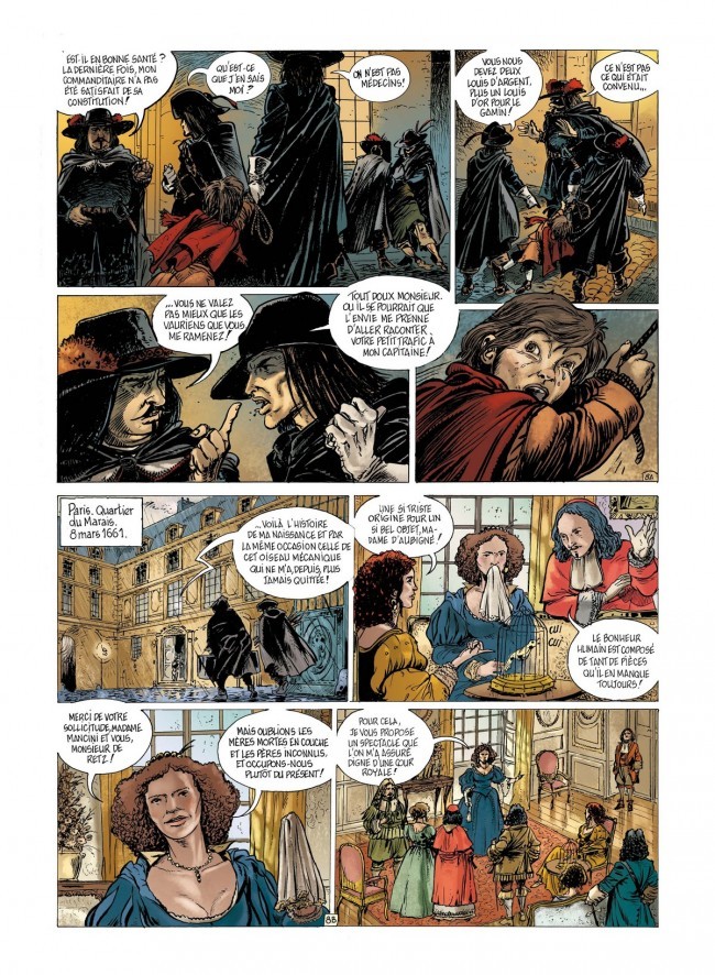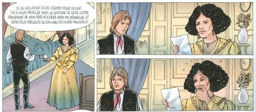 Alors, que faut-il en penser ? Vu la rapidité du financement, il est indéniable qu’il y a une demande pour ce genre d’aventure à caractère historique (fin du 17e siècle), avec une pointe de fantastique. Le projet a su séduire vite et bien. Le récit a de quoi accrocher et attirer l’attention. C’est d’ailleurs ce qui m’a séduit le plus dans ces deux albums. Il y a un fond et une recherche historique de départ puis l’élément fantastique qui va mener l’histoire jusqu’à son dénouement. C’est bien raconté, avec de l’action, des rebondissements. La narration est très linéaire, ce qui favorise la compréhension et en tant que lecteur, on se prend au jeu. Plus l’histoire avance, plus on a envie de connaître la suite. C’est le point fort de la série.