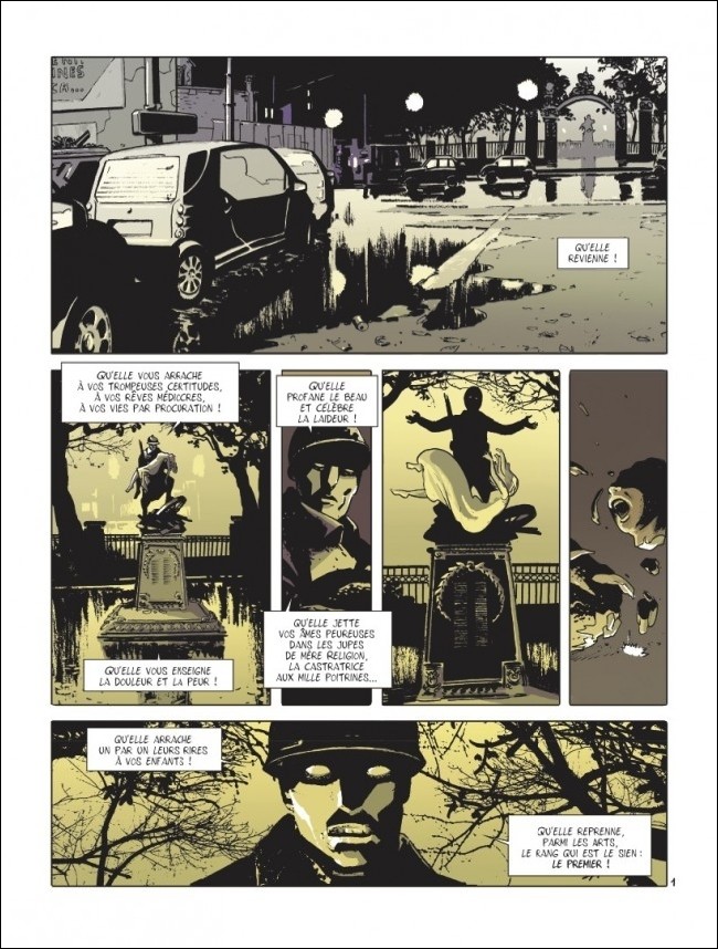 J’avais dans l’idée de penser à l’album comme un tout ! et je me suis rendu compte que je ne pouvais utiliser des couleurs vives. Après avoir vu une épreuve où le gris dominait, ce fut clair dans ma tête ! Les touches de couleur annoncent la vie et la mort comme si nous entrions dans une nouvelle dimension. Les arts sont la vie, le sang, la vie et la mort. La couleur donne une intensité dramatique et narrative très claire.