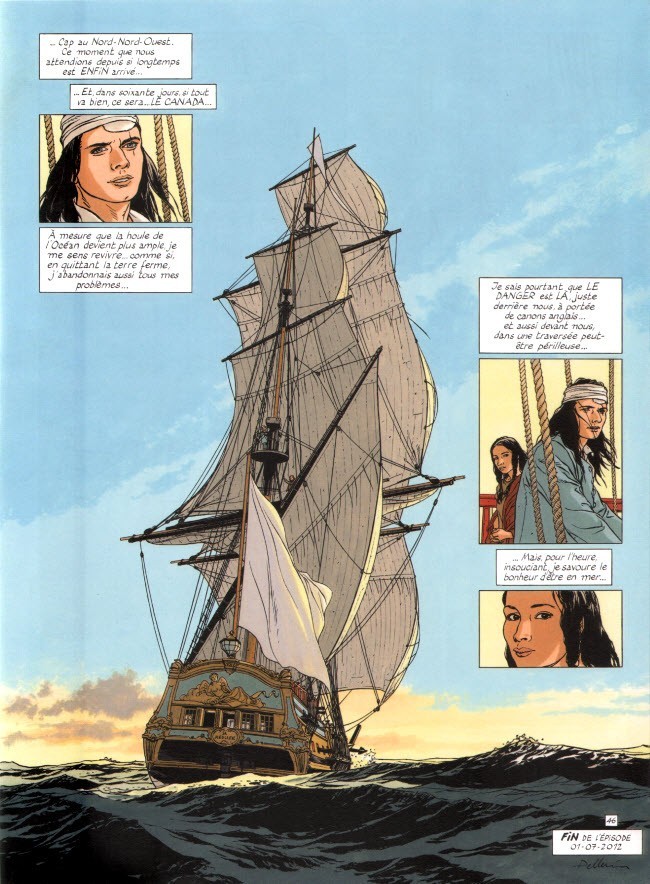 Résumé (de l’éditeur): Sur ordre du roi Louis XV, le corsaire Yann de Kermeur prend la suite d’un espion sauvagement assassiné au Canada. Sa mission ? Démêler les tensions explosives qui règnent entre Britanniques, Français et Indiens… bien que l’intrépide marin brestois ignore encore tout de ces vastes contrées ou de ses indigènes ! Mais les possessions du royaume de France au Canada sont en jeu, et les Anglais des ennemis redoutables… Après les perfides intrigues de la Cour de Versailles, après maints dangers et attentats évités de justesse à Brest, Yann parvient enfin à quitter le port.