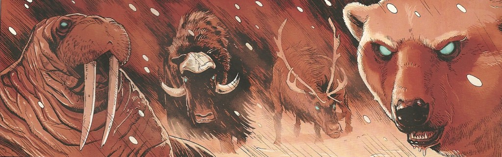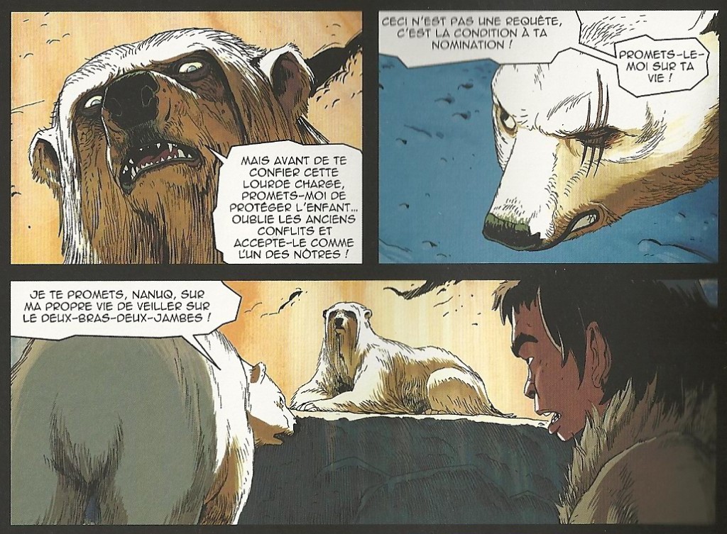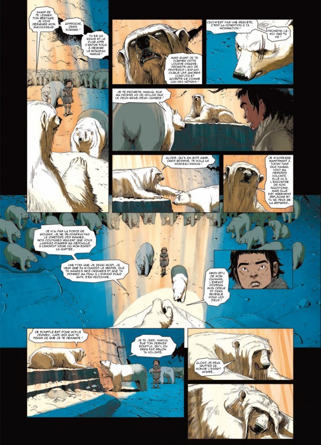 Paul Frichet sert cette histoire magnifiquement avec un graphisme fin et subtil, accompagné d’une palette de couleurs assez variée et inhabituelle dans le traitement des espaces glacés. Des tons les plus clairs aux plus sombres, toutes les couleurs y passent évitant ainsi la monotonie des tonalités blanc bleutées inhérentes à ce genre de décors. Cela renforce par ailleurs le côté légendaire du récit.