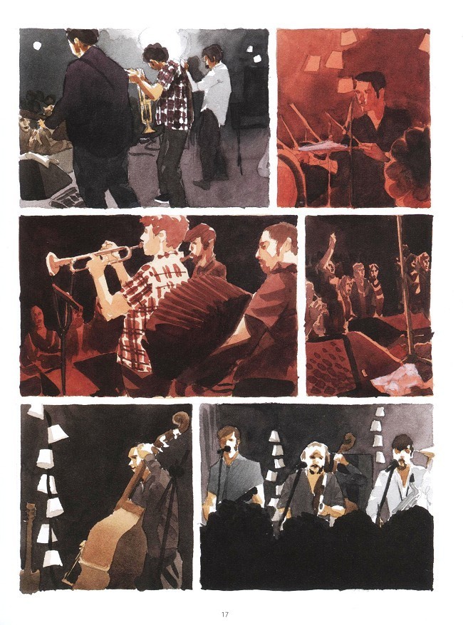 Je commence par le chapitre 1, c’est quand même mieux que de débuter par la fin (lol) !! Premier jour et premier concert des HDL, Nevers, cela m’intéresse étant Bourguignon, c’est presque chez moi. J’ai un peu de mal avec le coup de crayon N&B de Manu Moynot. Première case en couleur avec la section de cuivre des HDL et là que c’est beau !!! Le coup de pinceau de Manu Moynot est splendide !! Je continue ma lecture et vlan !!!! Je suis harponné par ce récit !! J’en oublie les dessins en N&B et j’accroche à fond sur l’histoire !!! Que du bonheur !!!! Hurlements en coulisses me fait penser à d’autres bandes dessinées de chez Futuropolis : Les Ignorants d’Etienne Davodeau, Un printemps à Tchernobyl et Voyage aux îles de la Désolation d’Emmanuel Lepage.
