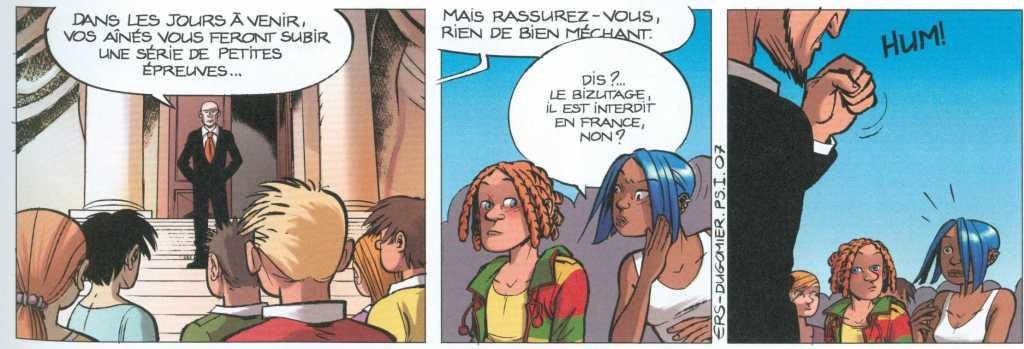 Mais là n’est pas le défaut principal de cet album. La narration est d’un ennui mortel. A aucun moment je n’ai pu entrer dans l’histoire et m’attacher à un personnage. On assiste dans la première partie à une succession de petits faits et mésaventures sans grand intérêt où le duo mal assorti se livre à des joutes verbales qui auraient leur place dans la cour de récré d’un collège, pour arriver à 10 pages de la fin sur un brin d’explication à propos des deux agents et de leur mission. Ce passage tombe un peu comme un cheveu sur la soupe et l’utilisation du flashback parait superflue tant on avait perdu espoir de trouver un intérêt à cette lecture. Une présentation plus classique des personnages en début d’album aurait mieux fonctionné.