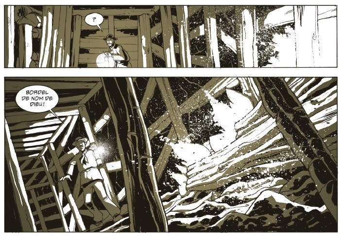 Le dessin semi réaliste et la bichromie sépia/noir parsemée de lueurs blanches permettent cependant de supporter l’insupportable. Le dessin est beau et lumineux, ce qui peut surprendre vu le sujet traité. Mais je trouve que c’est là une bien belle manière de rendre hommage à ces ouvriers que de les mettre en lumière. Jean-Luc Loyer a par ailleurs un vrai sens du cadrage et de la mise en scène. Les jeux d’ombres et de lumières donnent du relief au dessin ainsi qu’ au propos.