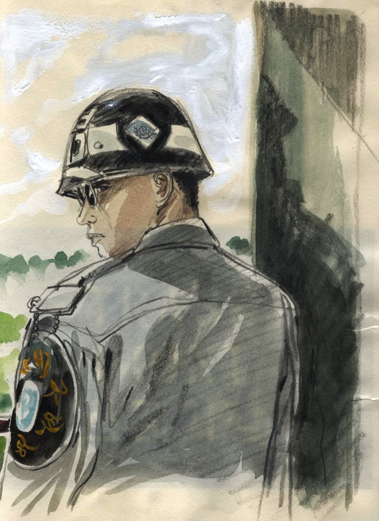 Thierry Bellefroid avait envie en tant que journaliste de se rendre sur la frontière entre les deux Corées, qui est très spécifique. Je l’ai accompagné. J’ai commencé ce jour là un carnet de croquis. Je voulais faire un petit carnet de voyage didactique pour parler de ce que je découvrais : un pays, son histoire, sa guerre. J’ai commencé à me documenter. Et plus je me documentais, plus je trouvais des richesses, des histoires et des personnages. Et très vite, j’ai trouvé un personnage coréen qui a été séparé de sa famille à la fin de la guerre, au moment où le 38e parallèle a été une frontière sur la carte. Et là a commencé l’écriture de « La douceur de l’enfer » qui s’appelait « Le soldat oublié » au départ. Je me suis rendu compte bizarrement que c’est une histoire qui intéresse peu les occidentaux pratiquement pas les européens. On n’en parle presque jamais. Les délégations belges et françaises qui sont parties à la guerre n’ont été reconnues que très tard. Ils ont été considérés comme des fous qui allaient combattre pour une guerre qui n’avait aucun sens. Il n’y a pratiquement pas de films sur la guerre de Corée. Il y en a sur la guerre du Vietnam mais pas sur la guerre de Corée. Je me disais : « je vais travailler sur un sujet qui n’intéressera personne». Alors pour que le lecteur puisse s’identifier au personnage, j’ai décidé de prendre comme personnage principal un gars comme moi qui découvre un peu malgré lui la Corée, un jeune homme de San Francisco, pour mettre en opposition le régime nord-coréen et américain. Le personnage de Billy Sumer part pour Séoul un peu parce qu’il est obligé. Il permet au lecteur de s’identifier, de rentrer dans l’histoire. L’histoire de la Corée est passionnante et je l’ai abordée par une petite facette. Il y a encore plein de choses à développer. La frontière est un peu comme le mur de Berlin. Un pays coupé en deux peut être une métaphore de notre Belgique qui a une épée de Damoclès au dessus de sa tête, même si ce n’est pas vraiment la même situation. La culture asiatique m’intéresse beaucoup. J’étais vraiment happé, transformé. C’était magique. Quelque chose s’est passé…