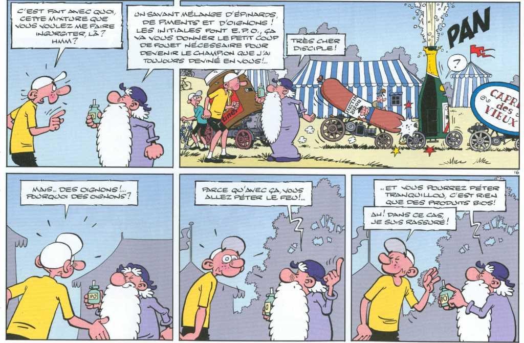 Dans ce tome, dans l’histoire principale de l’album, Léonard invente le vélo moderne et le Tour de France. Les similitudes avec la réalité seraient un pur hasard teinté d’une mauvaise foi crasse… Tout y passe : La caravane publicitaire, la préparation scientifique de l’athlète, les contrôles anti-dopage, le bisou de la miss à l’arrivée, l’E.P.O.,…Le disciple « simplet » va y donner toute sa puissance…Quel talent ! De Groot y montre tout son talent de scénariste d’humour. Turk nous sert un dessin bien maîtrisé et très expressif. Rien que les mimiques du disciple valent le détour…