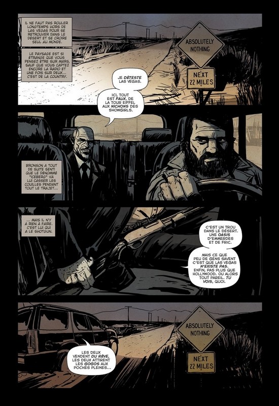 L’histoire concoctée par Améziane est somme toute assez simple et sans réelle surprise. Un kidnapping, une rançon, des jalousies, des rancoeurs tenaces, des narco trafiquants impitoyables, bref rien de très original pour ce genre d’histoire. En revanche, ce qui rend cette BD captivante, c’est son style. Améziane use (d’aucuns diront qu’il en abuse) habilement de flash-back et de flash forwards pour présenter au lecteur tous les rouages de son histoire. Avec cette narration complexe, il prend toutefois le risque de le perdre dans les bas fonds de Vegas. Mais le dynamisme créé par un découpage recherché, enrichi de dialogues incisifs, nous empêche de boire la tasse et nous tient en haleine jusqu’à la fin. A ceci s’ajoute un graphisme tout en bichromie(s) aux nombreux aplats noirs, plaqué sur des planches aux contours noirs comme s’il fallait enfermer un peu plus les protagonistes dans leur sombre univers.