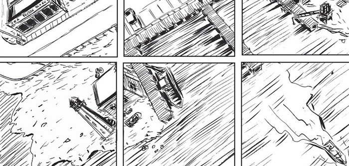 Que dire des dessins ? Le trait est brut, parfois haché. Pas de couleurs. Que du noir (et blanc) dans cette introspection. Et l’on peut le regretter. Les personnages père/fils se ressemblent étrangement, cela est sans doute voulu bien sûr, mais cela brouille les pistes. Des codes couleurs auraient pu aider à la compréhension. La force du travail de J Lemire est le découpage. Tantôt des gaufriers impeccables, tantôt des doubles pages très belle, tout en profondeur (dans tous les sens du terme !).
