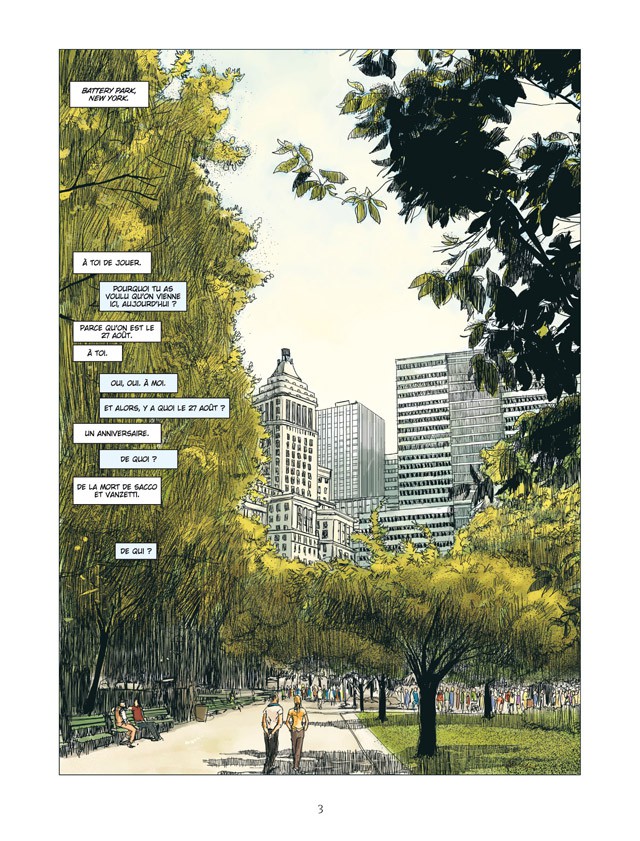 Cet album nous raconte l’une des plus grandes injustices qu’ont connus les Etats-Unis. C’est la voix d’un grand père qui raconte à son petit-fils ces évènements qui eurent lieu dans les années 20 en plein essor du syndicalisme. Sacco et Vanzetti, deux immigrés Italiens activistes anarchistes furent injustement arrêtés pour une histoire de braquage ayant mal tourné. Condamnés à la peine capitale, puis exécutés, cette affaire ébranla le monde entier et servit même la cause syndicaliste.