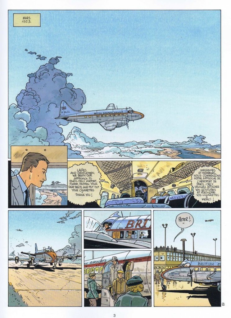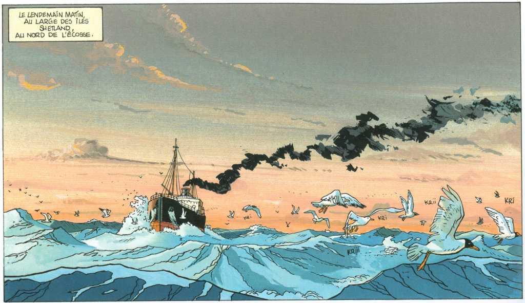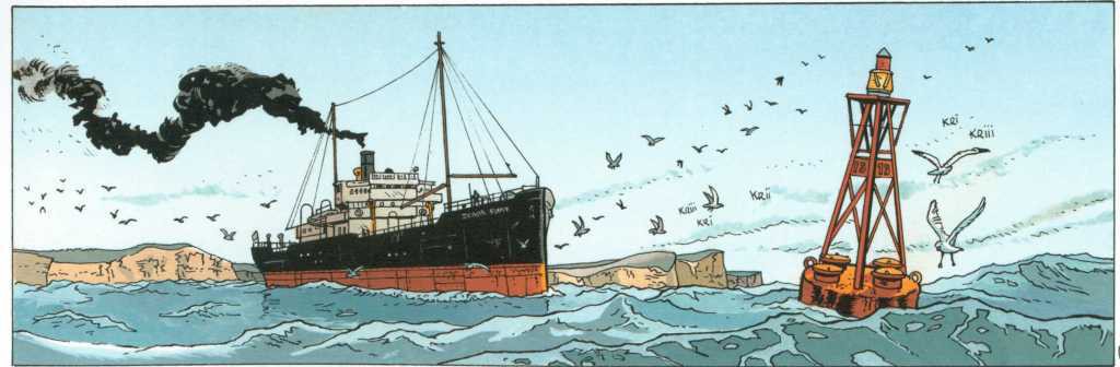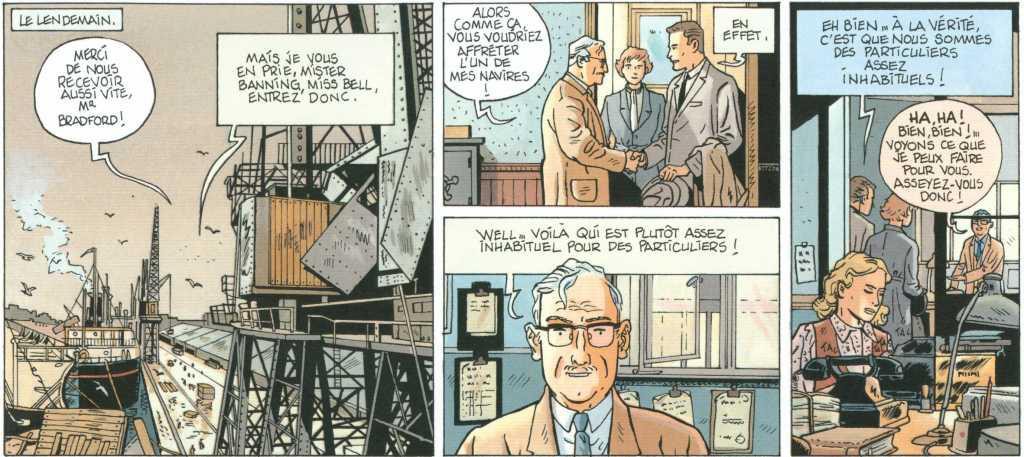 Il en profite pour nous faire visiter le Mont Saint-Michel ou la ville de Londres, magnifiquement dessinés. Bruno Marchand a le chic pour nous dessiner dans les moindres détails les lieux parcourus par les deux personnages principaux. En plus, le domaine maritime y est décrit de façon très précise et extraordinaire. Rien à redire, c’est parfaitement bien rendu. Le dessin est dans le style « ligne claire », le trait est dépouillé pour les personnages mais très détaillé et très précis pour les décors, les navires, les avions, les automobiles. C’est le point fort de l’album.