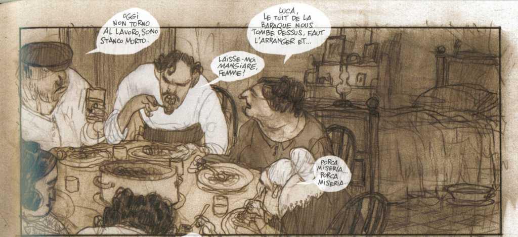 Au niveau du dessin, du graphisme, il faut s’accrocher. Le style est tout à fait particulier. Nous sommes loin, très loin de la ligne claire. Beaucoup de traits superflus. L’auteur esquisse plus qu’il ne dessine réellement. A force de superposer des traits, on voit apparaître les personnages, le décor. Les bulles sont translucides et dépassent parfois sur les cases annexes. Nous sommes loin d’une construction de planche rigide et bien balisée. Les tons sont dans les gris, bruns, les couleurs foncées tendant vers le noir. Ca, c’est pour la première partie.Il en sort beaucoup de nostalgie.