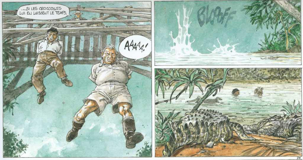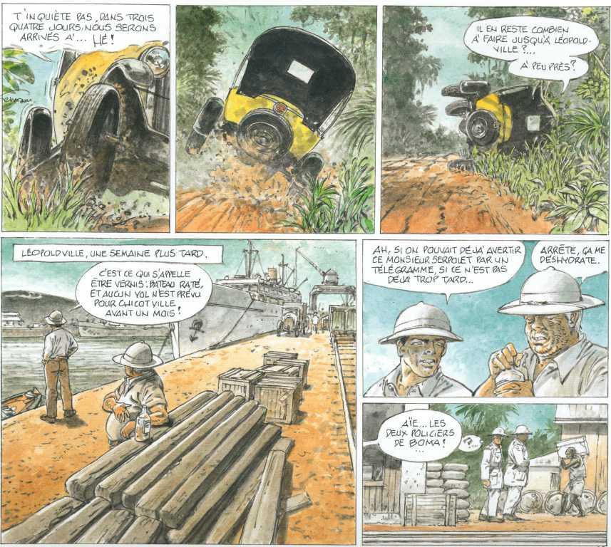 Pour en revenir au sujet, il s’agit de démêler une énigme, une enquête sur les exactions, les trafics de plusieurs personnes qui ont vécus au Congo à cette époque. Mais nulle part dans le scénario d’Yves H., il n’est fait état exactement de leurs exactions. Il s’agit d’un règlement de compte entre anciens associés sans autres précisions. Pour le reste de l’histoire, il s’agit d’une aventure à travers un pays, des paysages, une faune qui sont extraordinaires. Il s’agit d’un cliché d’une époque vue du côté des européens. Il y a de l’action, du rythme.