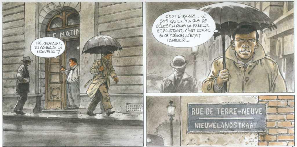 Mon avis : c’est le retour en one shot d’Hermann avec son fils, Yves H., en tant que scénariste. J’ai été agréablement surpris à la lecture de cet album. Comme le dit l’éditeur, il s’agit en effet d’un hommage à la bande dessinée des années ’50 et ’60. Je dirai plutôt un hommage appuyé à Hergé et à son mythique « Tintin au Congo ». Le personnage principal s’appelle Remy Georget (Georges Remy). Il travaille dans un journal à Bruxelles qui s’appelle « Le matin » (comprenez « Le Soir »). On voit dans une case une plaque « Rue de Terre-Neuve ». C’est une rue de Bruxelles qui a inspiré Hergé pour sa « rue du Labrador, 26 », l’adresse officielle de Tintin.