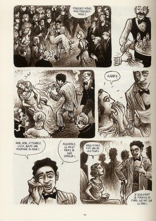 Ce livre est d’autant plus poignant que les dessins au fusain d’Eddy Vaccaro ne différencient pas les scènes de l’un ou l’autre milieu. Pas de couleurs. La vie complète de Young est traitée avec le même égard. Comme si le dessinateur souhaitait enfoncer le clou sur ce destin tragique. Mais le dessin reste un vrai plaisir. Il est très expressif avec un beau rendu de mouvement et cela jusque dans les combats de boxes.