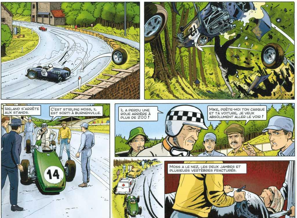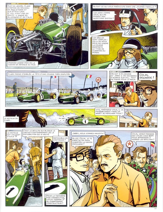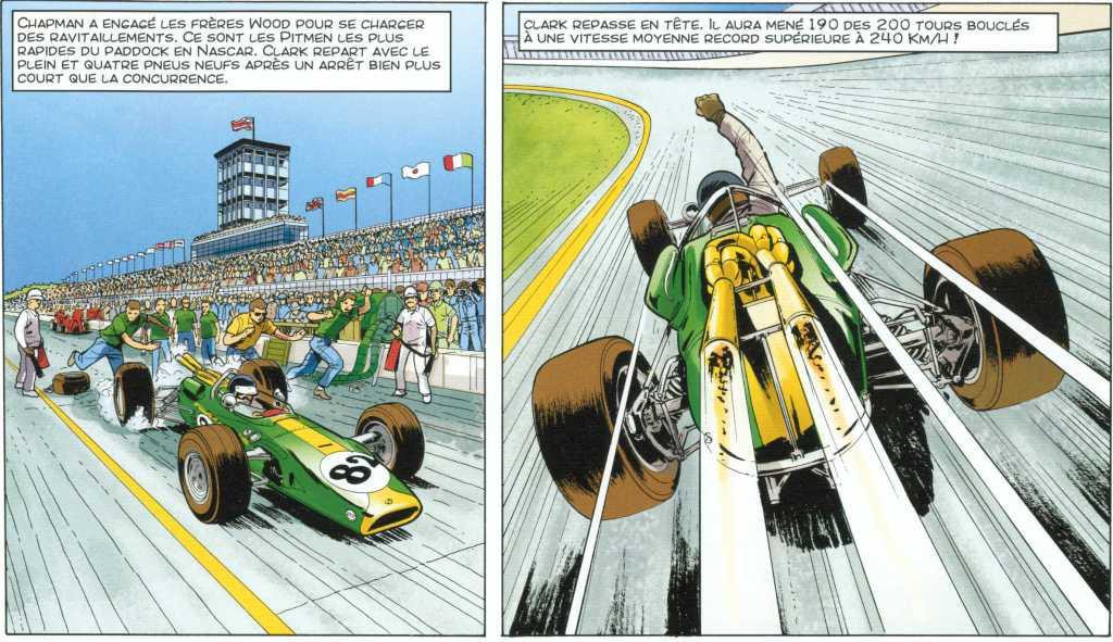 Au niveau du dessin, c’est l’éternel problème de ce genre d’ouvrage fait par des passionnés d’automobiles. Les voitures sont très bien dessinées avec des fiches techniques. Il ne manque pas un boulon ! Les scènes de courses sont bien reproduites. Par contre, mis à part Colin Chapman qui est bien représenté et reconnaissable, certains autres personnages sont parfois esquissés, peu ressemblants. Il ne faut pas être exigent sur ce point là. Il suffit de voir les écrans de télévision dont est affublé Gerard Crombac… Certains décors et arrière-plans sont parfois sommairement dessinés. Au final, le lecteur a devant lui des planches d’une qualité inégale. Certaines cases sont exceptionnelles, d’autres « bof bof »…De plus avec 3 dessinateurs par album, on se demande par moment qui a fait quoi. C’est le principe du studio mais c’est pour moi un peu frustrant au final.