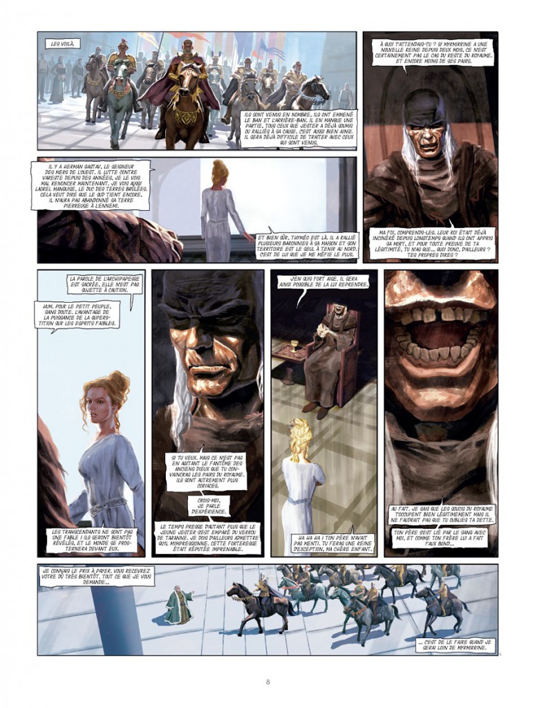 Après trois ans d’attente, voici enfin le tome 2 de cette série médiévale fantastique. Le tome 1, « le poids de nos victoires » avait laissé Hector et ses compagnons en pleine fuite. Il était temps d’en apprendre un peu plus sur cette saga. De saga, il en est bien question. En effet, les poncifs de récits chevaleresques (l’honneur, la passion, les combats titanesques, les trahisons….) sont bien présents et donnent une fièvre aventureuse classique. Mais, cette BD trouve son originalité dans les trames de l’intrigue et dans les nombreux intervenants. L’envergure des personnages secondaires aboutit à une équation terriblement complexe. Peut-être même un peu trop : il faut se concentrer pour suivre et comprendre les actions des différentes maisons nobiliaires et des différents individus Les protagonistes s’affrontent, se trahissent et se retrouvent dans un tourbillon de flash-back et de passage de scène à l’autre sans transition. La lecture (re – ?) du tome 1 est fortement recommandée. Il en ressort un album mené tambour battant. La dernière case du récit vous laisse pantelant de tant d’actions, de révélations et évidemment … de questions ! A ce sujet, la maison d’édition Le Lombard a raisonnablement mis en avant cette très belle série en seulement trois tomes (Attendu fin 2014, le tome 3 « La voix des morts »). Et c’est tant mieux ! Car le nombre de personnages et de personnalités seront soumis forcement aux feux de la rampe. Cela mériterait (presque) des spin-off.