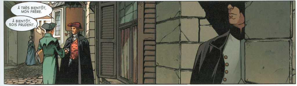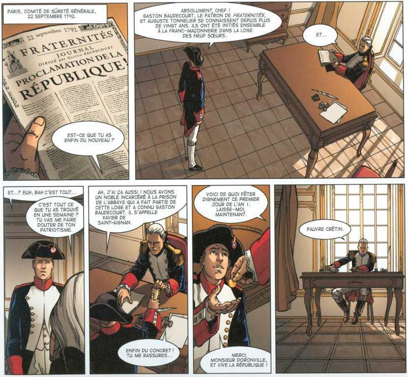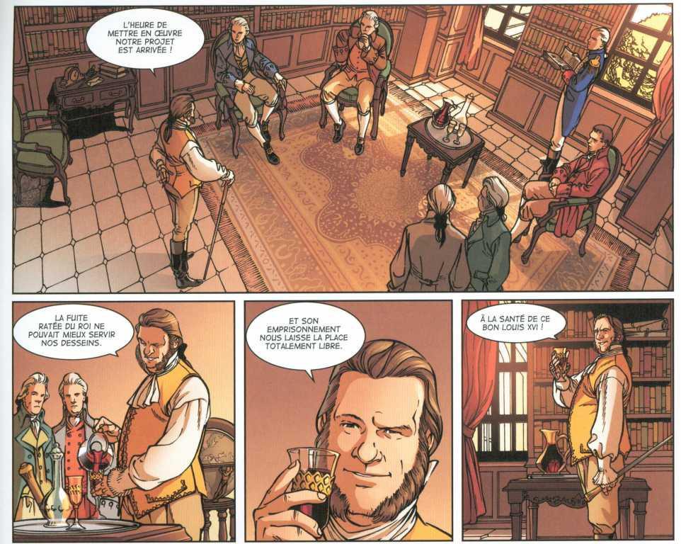 Le dessin de Ramon Rosanas (une découverte pour moi) est très bon, maîtrisé et plaisant, tout en restant dans un certain classicisme. Le scénario de Jean-Christophe Camus mêle habillement des faits réels et historiques à une histoire de famille romancée. Mais ce récit tient la route et capte directement le lecteur que je suis. La narration est bien rythmée et les personnages, complexes, sont bien décrits au niveau psychologique. Il faut bien dire également que la période troublée est une magnifique rampe de lancement à une saga qui va pouvoir se prolonger pendant toute la période de la terreur (où la franc-maçonnerie a été fortement mise à mal) mais aussi pendant la période napoléonienne. A noter enfin qu’en fin d’album, les auteurs annoncent la suite de l’histoire pour la fin de l’année 2014. Des notes historiques remettent également l’histoire dans son contexte historique.