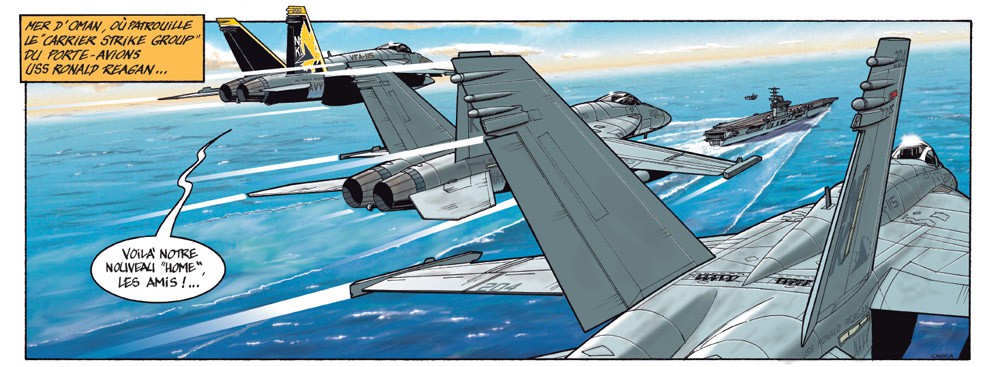 « Francis Winis, le dessinateur, était ingénieur dans l’aérospatiale et instructeur d’astronautes à la NASA. Son exigence et son souci du détail lui permettent de donner un niveau de réalisme exceptionnel aux scènes de combat aérien. » d’après les éditions Dupuis. C’est vrai, les avions sont très bien dessinés. F. Winis transpose les avions en 2013. Car en fonction des époques de chaque tome des « aventures de Buck Danny », le matériel aérien évolue et se met au gout du jour (mais pas les héros qui ne vieillissent ni ne changent de trait de caractère) : ainsi en 2013, des F-18 hornet côtoient du matériel russe derniers cri. Les combats (« dogfight ») sont vivants, dynamiques et maitrisés. La sensation de ressentir les « G » est prégnante. Le lecteur sent bien que le dessinateur a baigné dans le milieu. Par ailleurs, il s’est approprié le découpage cinématographique de la série maintenant ainsi l’intensité de l’action.