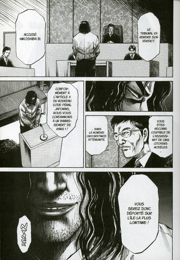 J’ai découvert cette série via un ami qui m’a prêté les 3 tomes de l’Ile infernale. Le pitch de cette série : le Japon a remplacé la peine de mort par la peine d’exil. Les condamnés à cette peine sont donc déportés sur des îles prisons coupées du monde. Là bas les prisonniers sont livrés à eux même sans aucune surveillance de la part de l’Etat.